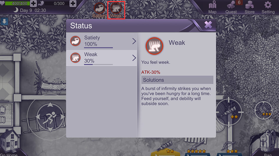 If your value of satiety is 0, a ‘weak’ icon will appear, which will reduce your attack.