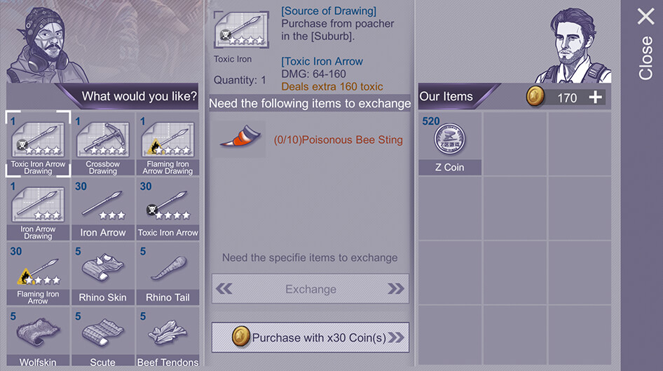 You can make a trade in 3 ways: Exchange with items, purchase with Z coins and purchase with coins. If you want to purchase with Z coins please remember to put Z coins in your bag when you leave the shelter.