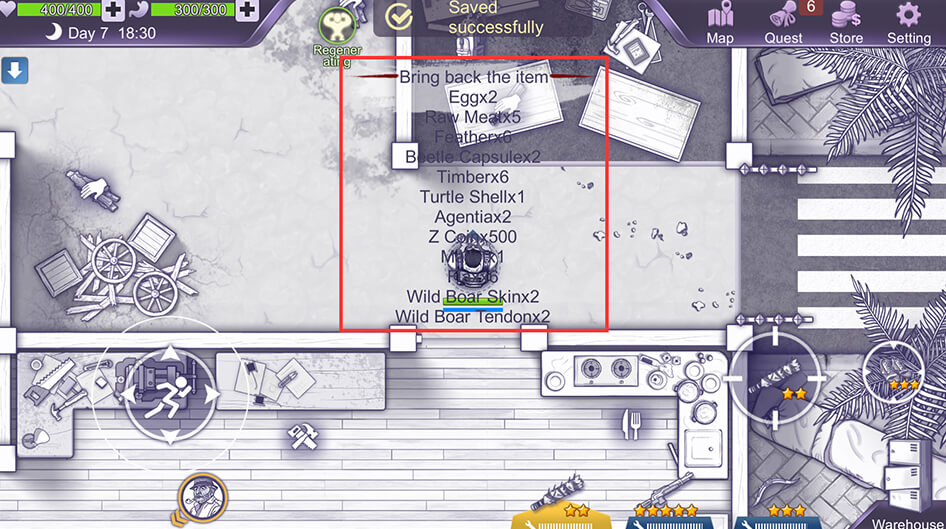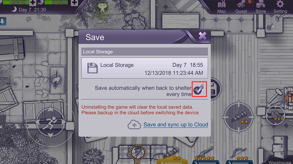 Please DO go back to the shelter when you want to quit, your game data will be saved automatically. If the ‘Saved successfully’ icon doesn’t show up, please go to the TV, click the storage icon and tick the option ‘save automatically when back to shelter every time’.
