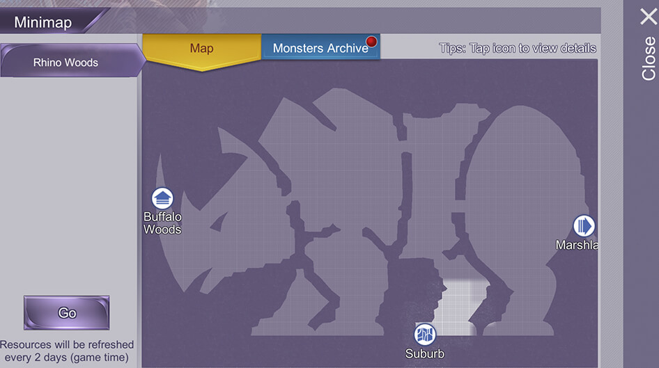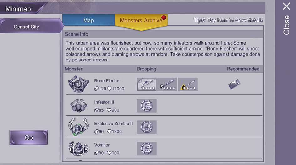 You can also check the Monsters Archives when you open the Map page. Monsters’ information (attack, HP), dropping and recommended weapons will be displayed there.